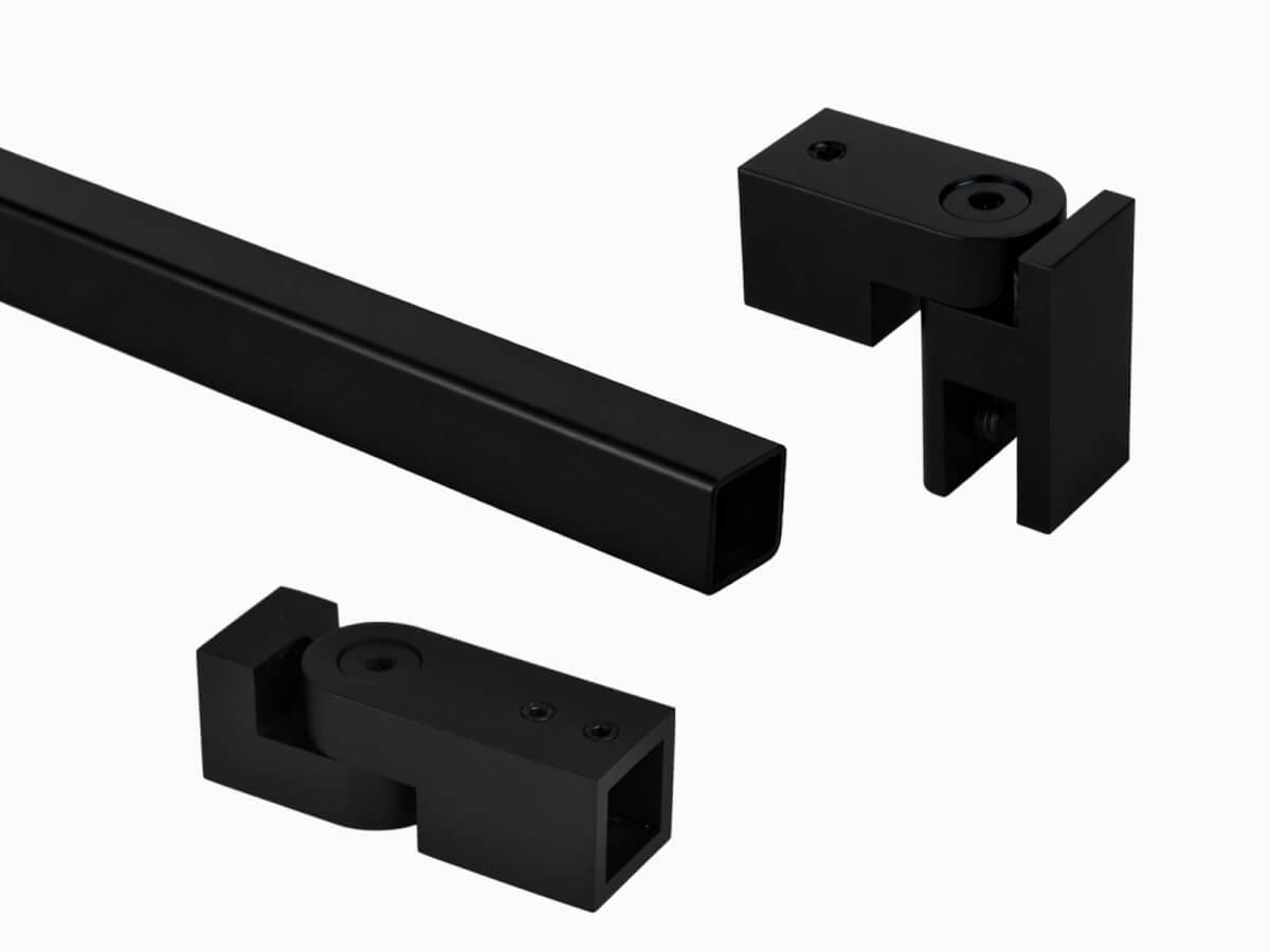 Die Beschläge für Ihre Dusche werden aus Aluminium oder Messing in schwarz matter Optik gefertigt. Je nach Einbausituation bilden wir für Sie die optimale Zusammensetzung Ihrer Glas- und Wandbeschläge.